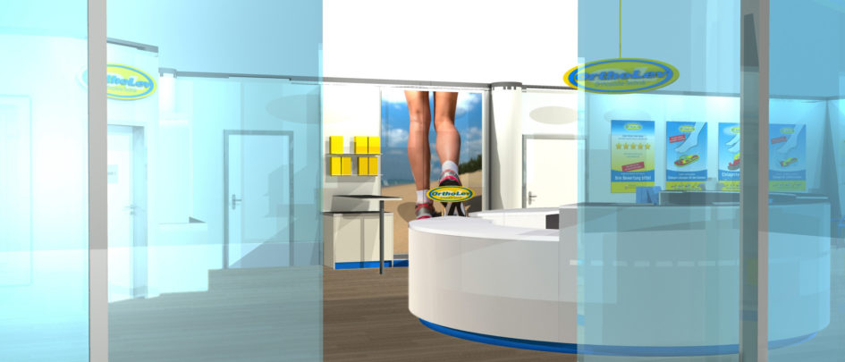 Neue Geschäftsräume für OrthoLev sollen auch in die Gesamtgestaltung der Firma einfließen. Die Farben, die Formen und die Verwendung der Bilder sollen zum Design und Marketing des Unternehmens passen. Um einen ersten Eindruck zu bekommen und eine Grundlage zur Abstimmung zu haben, werden die 3D-Drahtgittermodelle mit Texturen versehen, die die Beschaffenheit des Bodens, der Wände und Möbel zeigen.